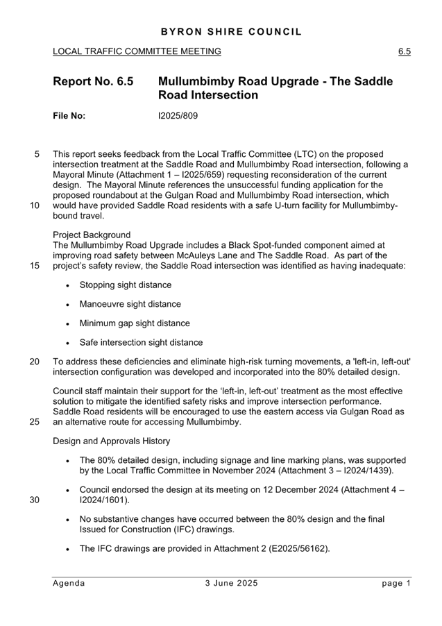 This report seeks feedback from the Local Traffic Committee (LTC) on the proposed intersection treatment at the Saddle Road and Mullumbimby Road intersection, following a Mayoral Minute (Attachment 1 – I2025/659) requesting reconsideration of the current design. The Mayoral Minute references the unsuccessful funding application for the proposed roundabout at the Gulgan Road and Mullumbimby Road intersection, which would have provided Saddle Road residents with a safe U-turn facility for Mullumbimby-bound travel.