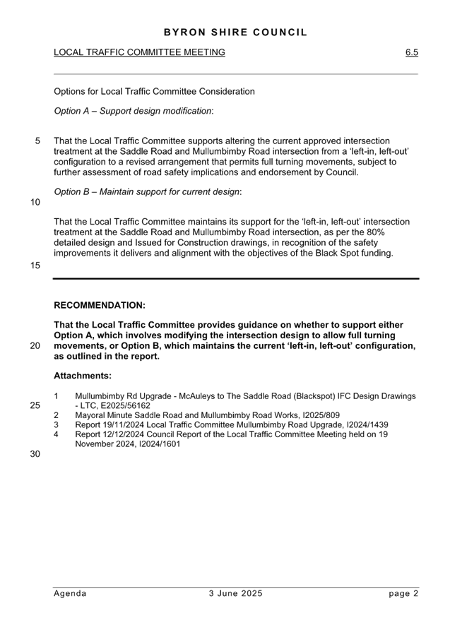 That the Local Traffic Committee maintains its support for the ‘left-in, left-out’ intersection treatment at the Saddle Road and Mullumbimby Road intersection, as per the 80% detailed design and Issued for Construction drawings, in recognition of the safety improvements it delivers and alignment with the objectives of the Black Spot funding.