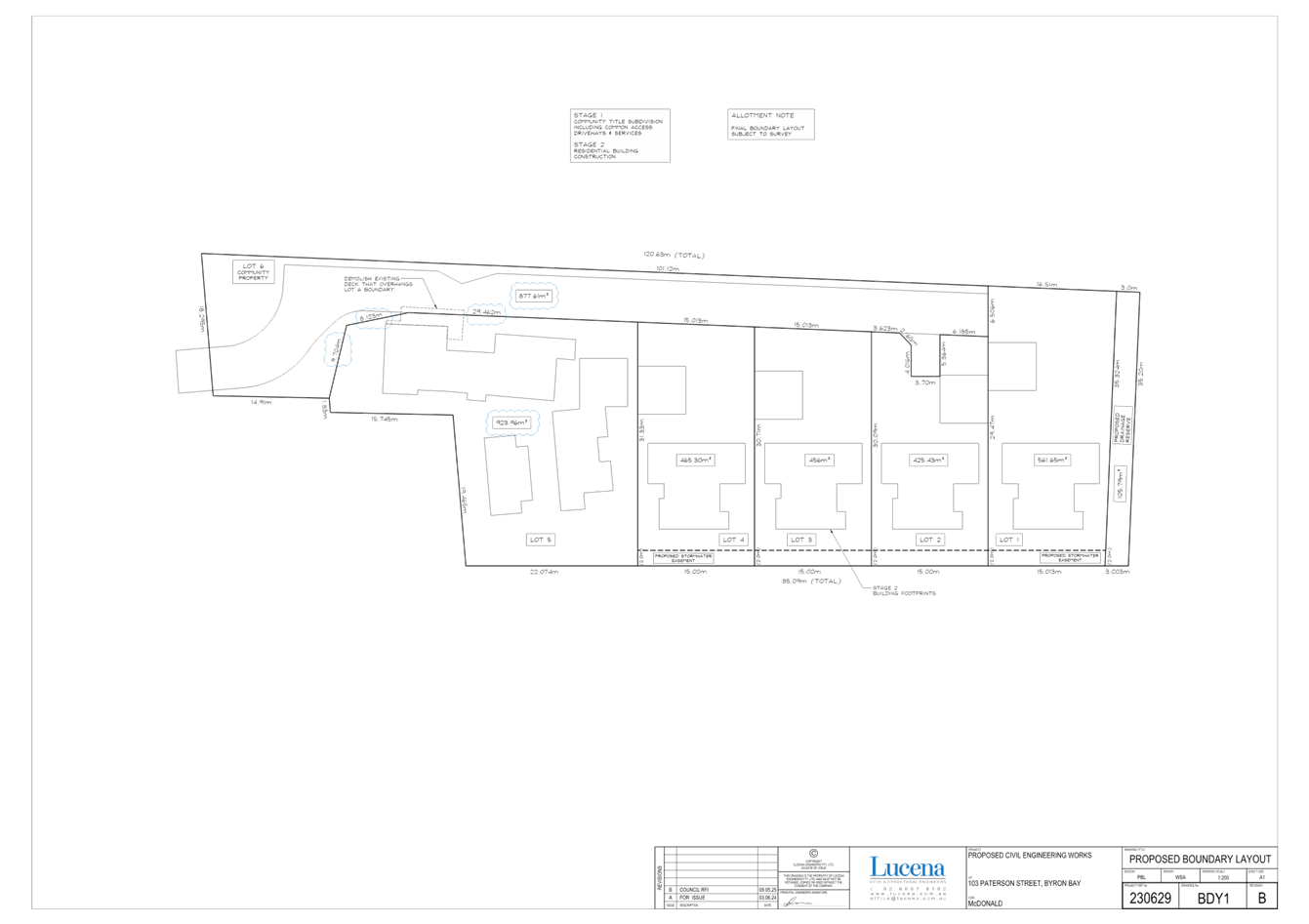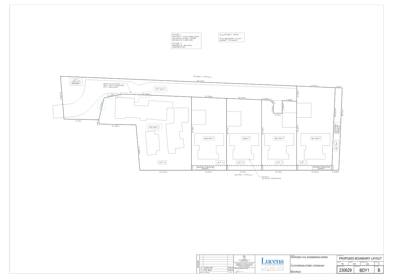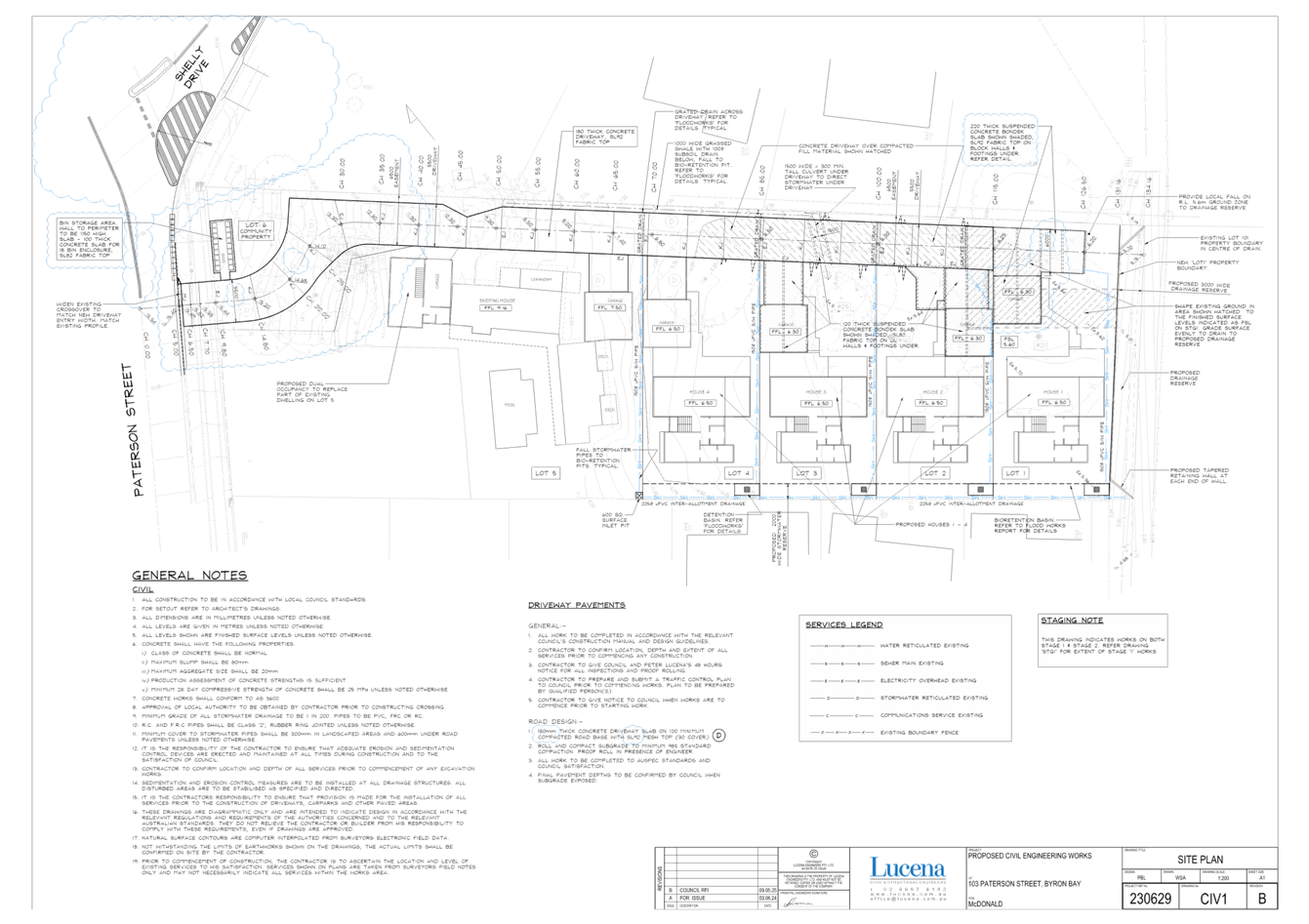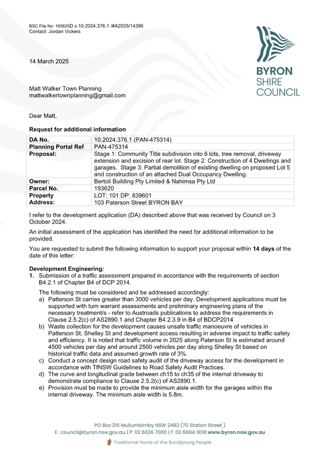 Council’s development engineer is currently assessing a development application – 10.2024.376.1, for the creation of a 5-lot Community Title Subdivision, construction of four detached dwellings on vacant lots and the construction of a dual occupancy to the existing dwelling in 103 Paterson St, Byron Bay.