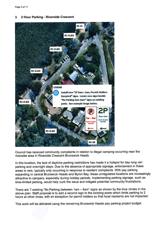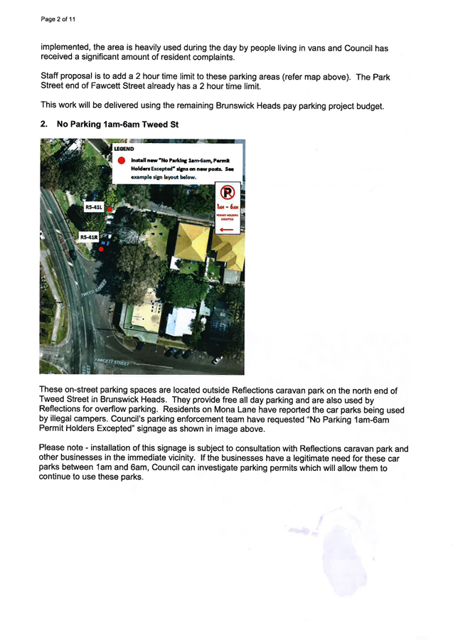 Council has received ongoing complaints from residents of Fawcett Street since the introduction of paid parking in Brunswick Heads. The complaints relate to 40 plus illegal campers parking all day long in the 2hr parking zone on the Southern side of Fawcett Street, Brunswick Heads. They are not parking on the northern side which has paid parking installed.