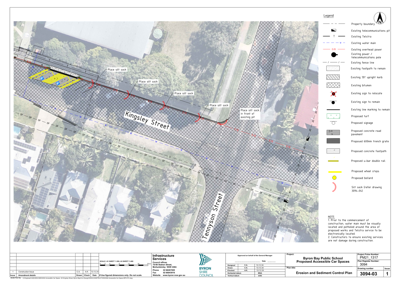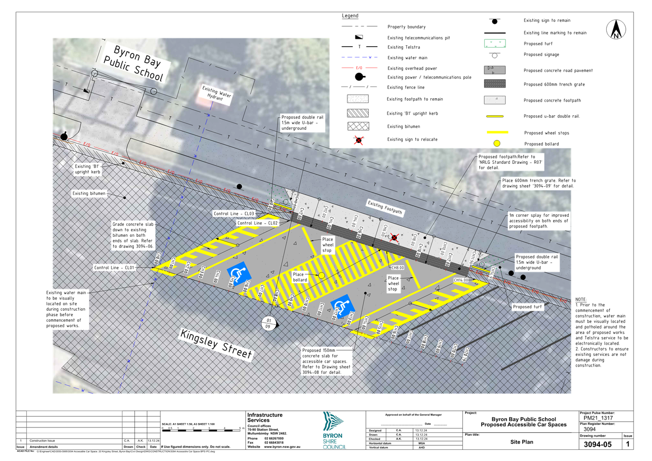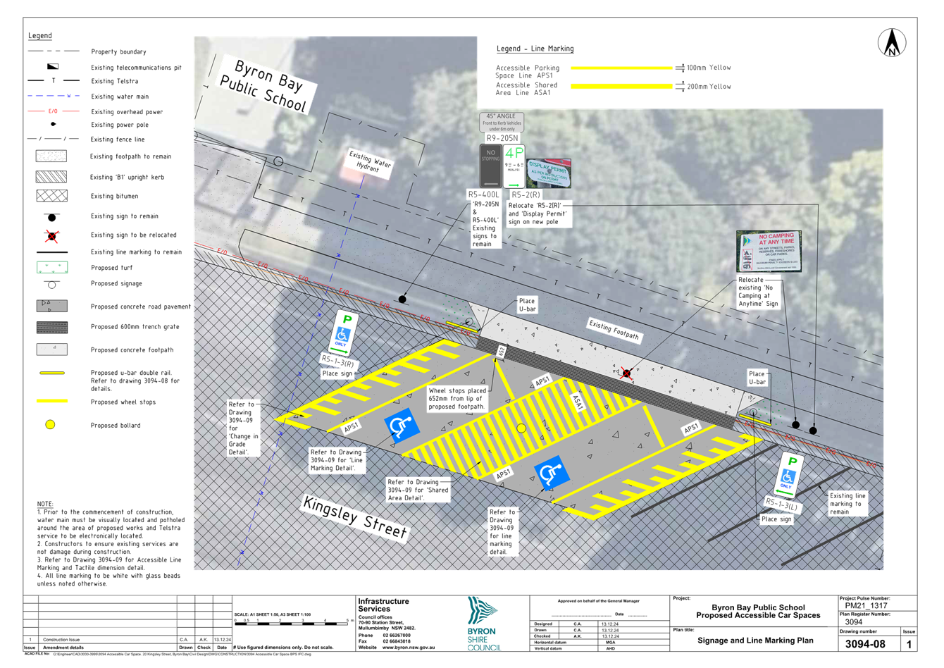 Construction of two accessible car parks in front of Byron Bay Public School in Kingsley Street. The request was sent from the school and parents to our Parking Enforcement team. Request was expedited as it was noted a new enrolment for 2025 school term would require accessible parking. Further information on this project within the attached memo (Attachment 3)