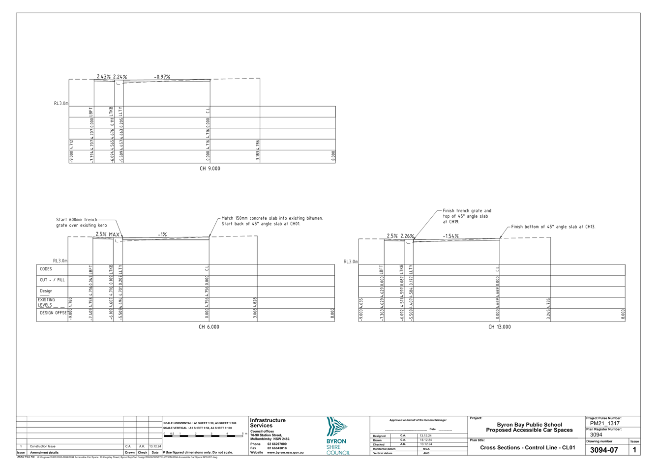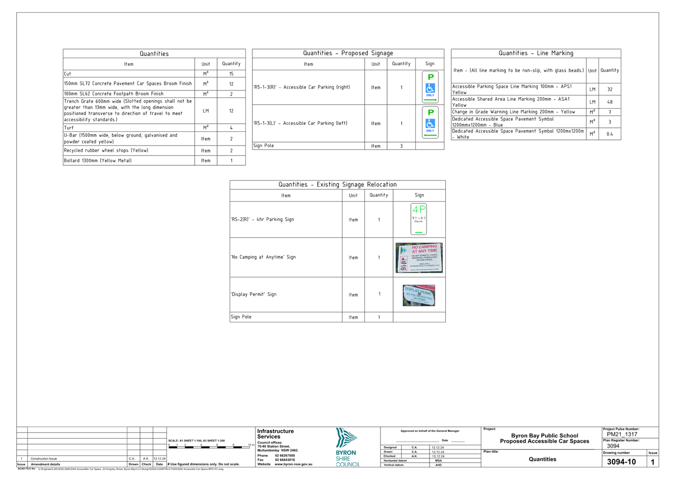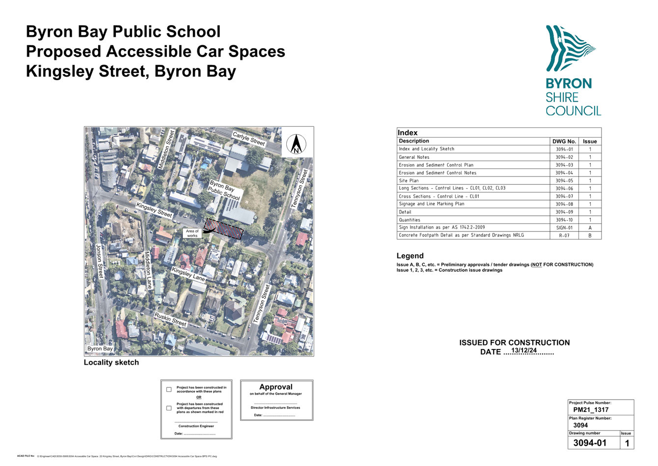 Construction of two accessible car parks in front of Byron Bay Public School in Kingsley Street. The request was sent from the school and parents to our Parking Enforcement team. Request was expedited as it was noted a new enrolment for 2025 school term would require accessible parking. Further information on this project within the attached memo (Attachment 3)