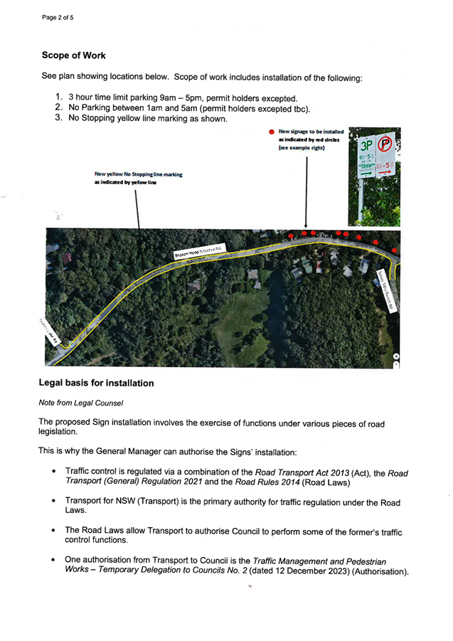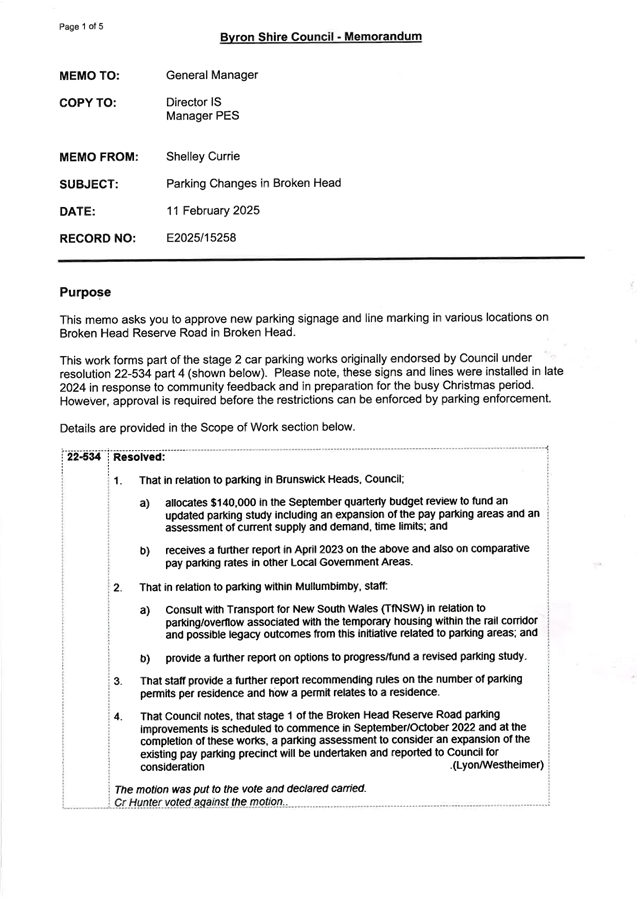 Installation of new parking signage and linemarking on Broken Head Reserve Road as detailed in the memo (Attachment 5).