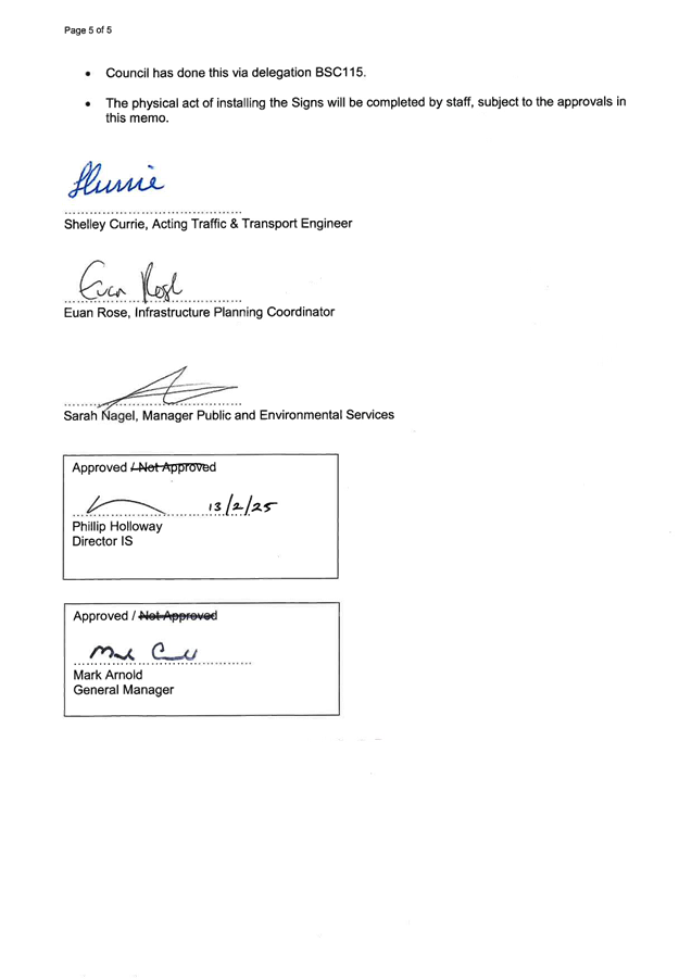 Installation of new parking signage and linemarking in Cenotaph Lane as detailed in the Scope of Work within the memo (Attachment 2).